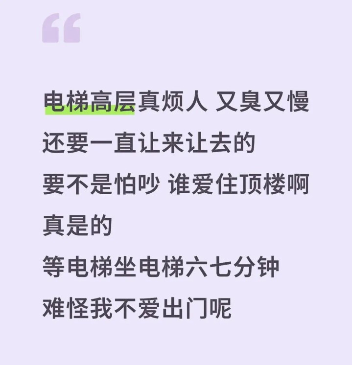 住顶楼,出行全看电梯脸色!早高峰晚高峰等电梯,能等得人心态爆炸,碰上停电或故障更是直接崩溃。