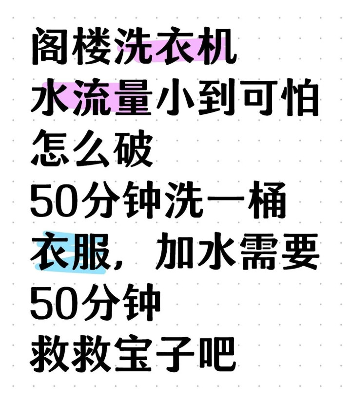 最烦的是洗衣机注水,别人家半小时洗完,我家得等一小时注水,赶上用水高峰,洗衣机还会因为水压不够停止工作,真的太磨人了!