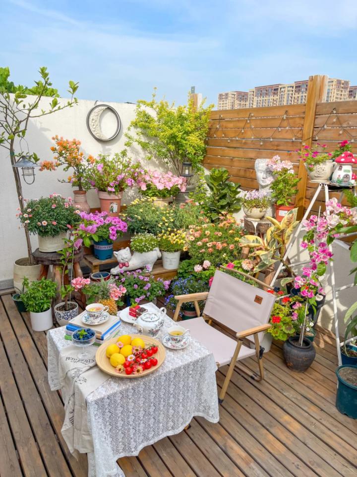 我把露台改造成了空中花园,种了月季、多肉,还有小番茄、生菜,春看花开、秋摘果,周末在露台喝茶赏花。