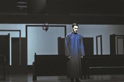 舞台空间设计上,数个简易门框构筑起迷宫式结构,三面围绕着象征周家客厅的核心表演区。客厅上空始终悬挂着由三面深色布景板合围而成的墙体,呼应《雷雨》开篇舞台提示中对周家深褐色的、暗得褪了色的空间设定。而在大部分演出时间里,舞台深处均以白色墙面作为角色上场的背景。直至结尾,所有角色齐聚周家客厅,随着繁漪将周朴园喊来,所有隐秘的人伦关系、矛盾冲突被彻底揭开,这三面深色墙体才正式落下,拦截下所有试图从这座牢笼中逃离的人物与情欲,让观众共同见证这个众人困于其中、以悲剧收场的故事。