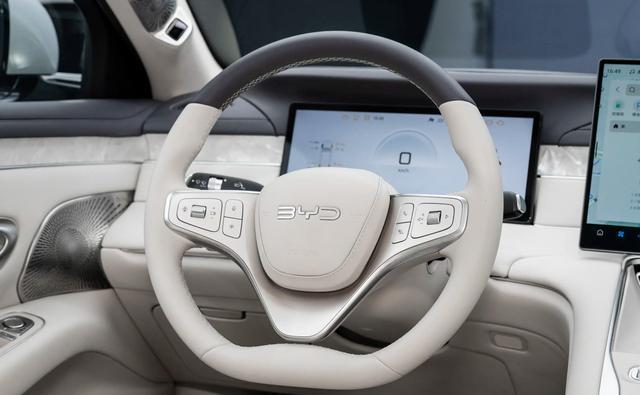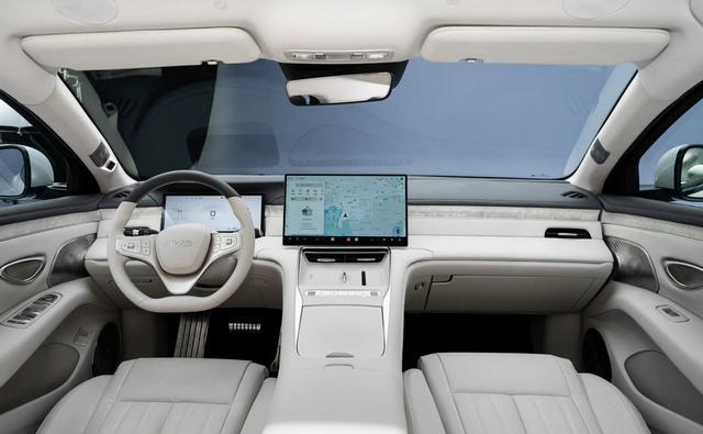 进入到驾驶舱来看,海豹08其实在中控台造型的部分没有带给咱们什么惊喜,前端是多层立体平台、副仪表台与中控形成了T型连贯,而门板位置也会伴随中控台的走势形成一定环绕感。比起外观,可能中控造型部分是略显平淡了些,但好在这里有肉眼可见的高级用料,不论是中央横贯的贝母饰带,还是上下广泛的软包,甚至是多区域的哑光金属,这倒是不会影响车辆的30万级定位。