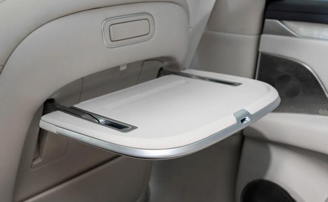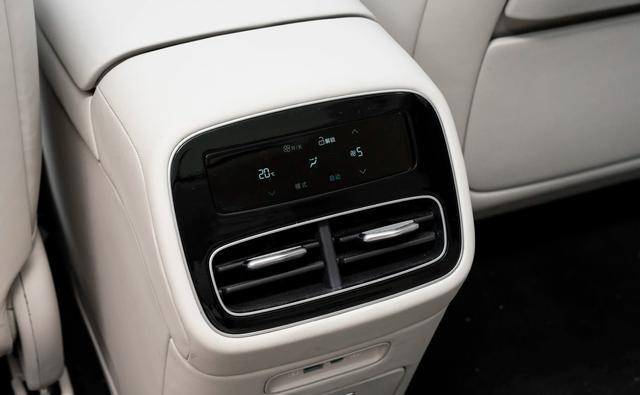 当然,在细节上,海豹08其实也是有一些创新的。就比如说它的方向盘,除了采用撞色真皮外,它看上去是三辐式,但实际上中央控制台的下辐与盘辐是分离开来的,质感上更时尚。而在门板的处置上,它的门板扶手也采用了弧形结构,同样可以体现品牌调性。同时,在配件方面,我们还看到了A柱摄像头、二排小桌板、二排空调触控屏以及环绕式布局的扬声器,应该说该有的都有了。